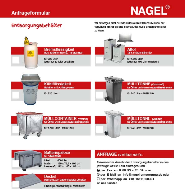 Das Anfrageformular kann auch als PDF heruntergeladen werden. Einfach ausdrucken, ausfüllen und bequem per Fax an 0 60 93 – 23 34, per E-Mail an info@nagel-entsorgung.de oder per WhatsApp an +49 151 11308394 zurücksenden. So lässt sich die Anfrage flexibel offline bearbeiten und einreichen.