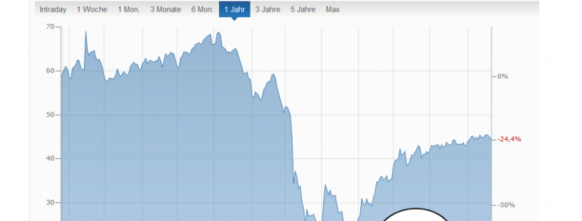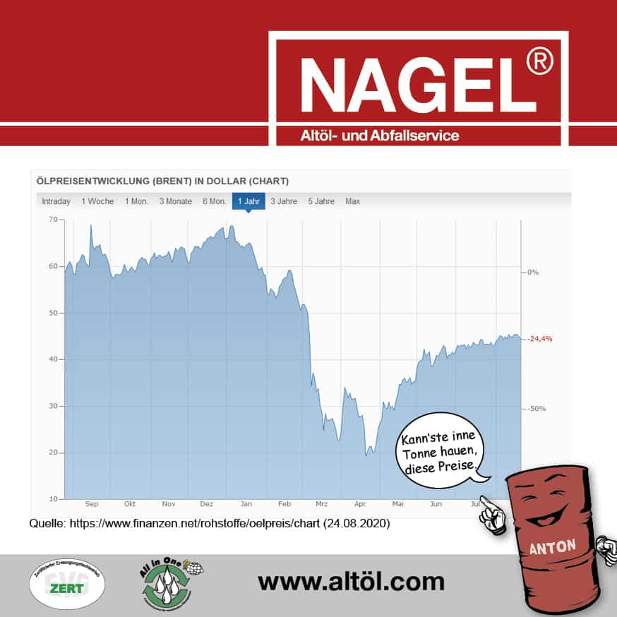 Der Rohöl-Preis, der den Altöl-Preis mitbestimmt, stabilisiert sich. Jedoch leider auf niedrigem Niveau (siehe Grafik). Er konnte sich nach der ersten Corona-Lockdown-Phase im Frühjahr nicht erholen.